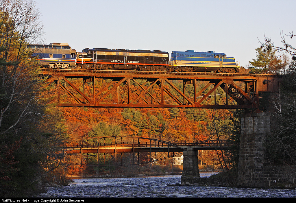 Golden Hour. The very last light of the day hits the bridge about 45 minutes before sunset. The shadows surrounding the bridge will over take the entire bridge within minutes. This train represents the very last SB train of a very successful Summer-Fall season schedule. Next up will be the Polar Express out of Saratoga and then, after Christmas, Snow Trains will carry skiers to Gore Mountain in North Creek for the first time in too many years to remember. This train is also significant in that it represents the use of MU'ed road power north of Corinth which, prior to Oct. 27th, had not occurred since November 17, 1989. Finally, the ex BAR BL2 should be right at home MU'ed to an EMD cab as BAR usually ran its BL2's and F units together.