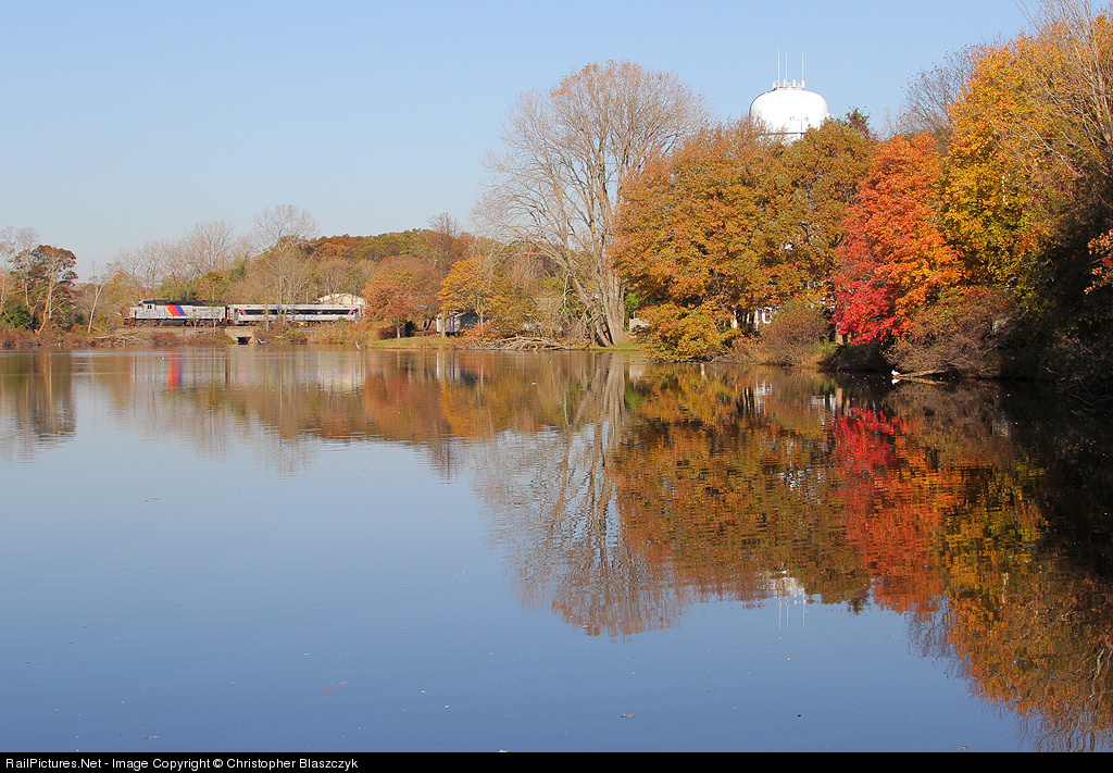 | Fall at the Jersey Shore. NJT 4217 accelerates southbound away from the Spring Lake station and over North Brook, which is lined with colorful trees on the second day of November. |