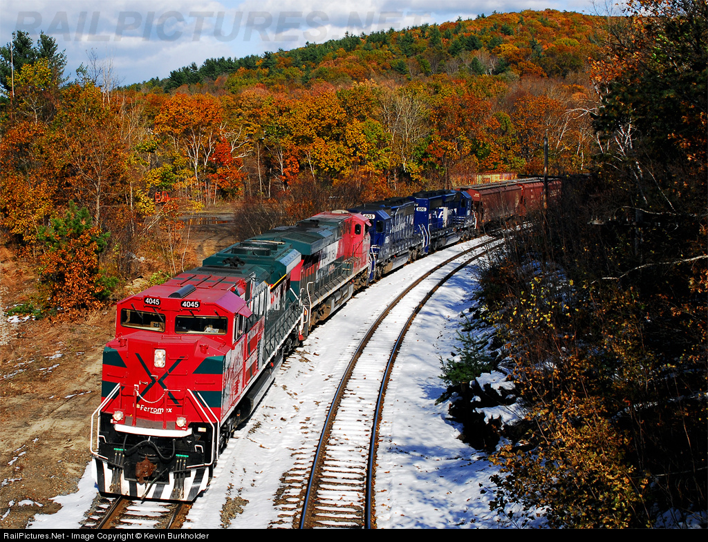 | The Pan Am empty Grain Extra is on the super elevated curve at Millers Falls, MA, with FXE SD70ACe 4045 and ES44AC 4636 (with 10th Anniversary logo - 1998-2008) leading Pan Am-painted SD40-2s MEC 605 and 606 ahead of the empty 110-car grain train westbound on the former Boston & Maine trackage. Fall and winter converged last weekend in New England and remnants are still visible in this scene. Many more photos at http://steelwheelsphotography.com. |