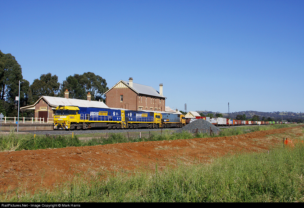 A 1800m Perth-Sydney superfreighter lead by NR41 with NR37 and NR13 sit at West Cootamundra station awaiting a path onto the main South line.