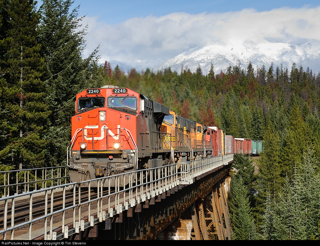 | CN 2240 leads an empty coal train destined for the PRB across the Canoe River, west of Valemount, BC. On the headend of this train were 32 cars of mixed freight for Vancouver. |