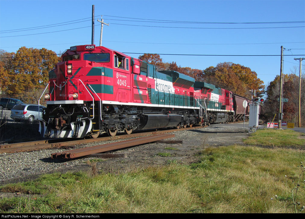 | For the first time in recorded history two back to back Ferromex units visited the old B&M to Ayer Mas on a loaded grain train. The return empty move is seen departing "Airport Crossing" with 110 hoppers on the Rotterdam Branch after a crew change. The train took two days to reach Rotterdam Junction due to delays making for a nice early morning Saturday 'gift'. |