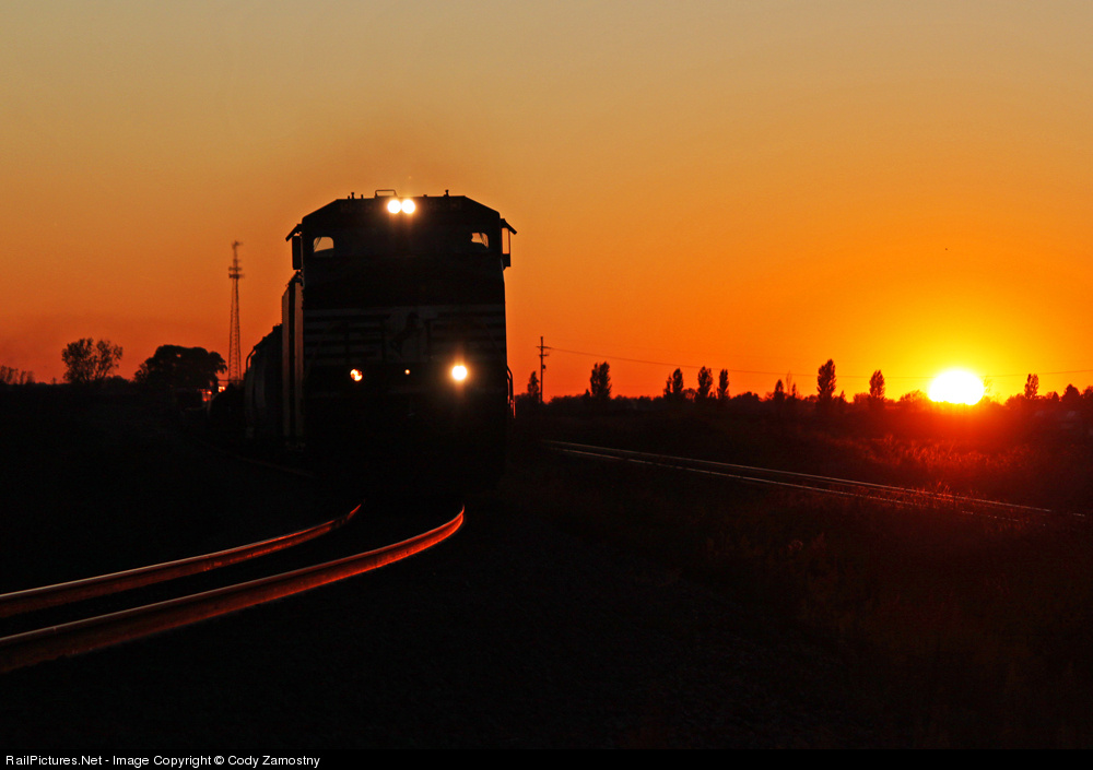 Mixed freight 316 charges eastbound towards the Bort Road grade crossing at sunset. You can see the glint of the rails on the old NYC adjacent to the NKP.