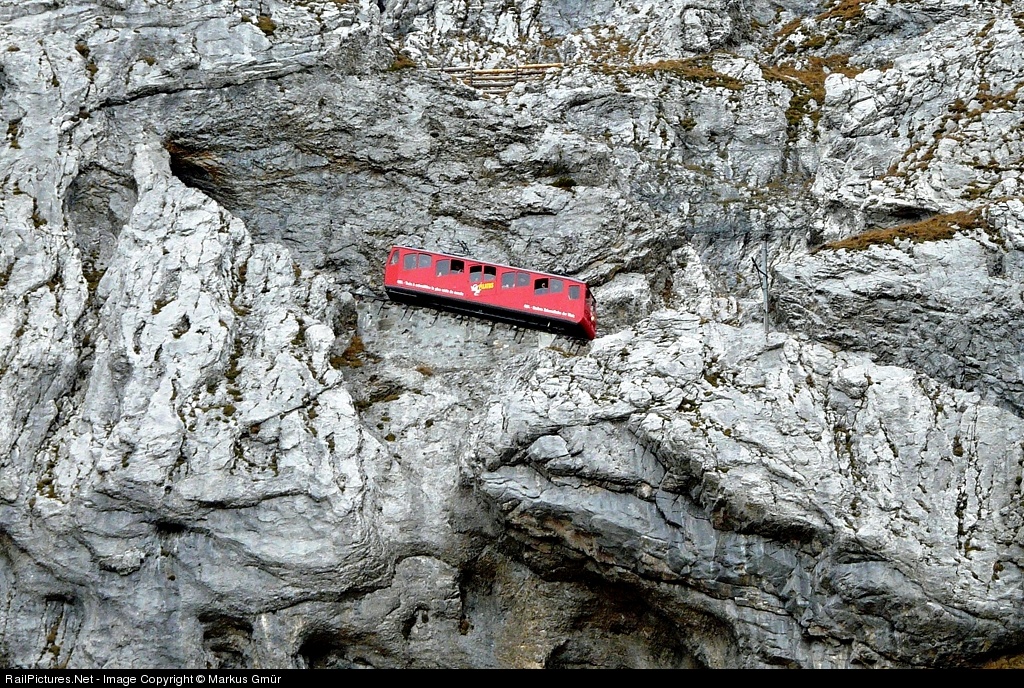 That's mountain climbing: railcar from the Pilatusbahn, the world's steepest cogwheel railway (48%), in the 'Eselswand' between Aemsigen and Pilatus Kulm, about 2000 meters over sealevel