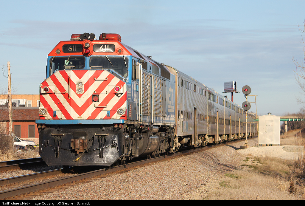 | Metra 611, one of the last two operating F40C's on Metra's roster, pushes east with an afternoon rush hour train. |