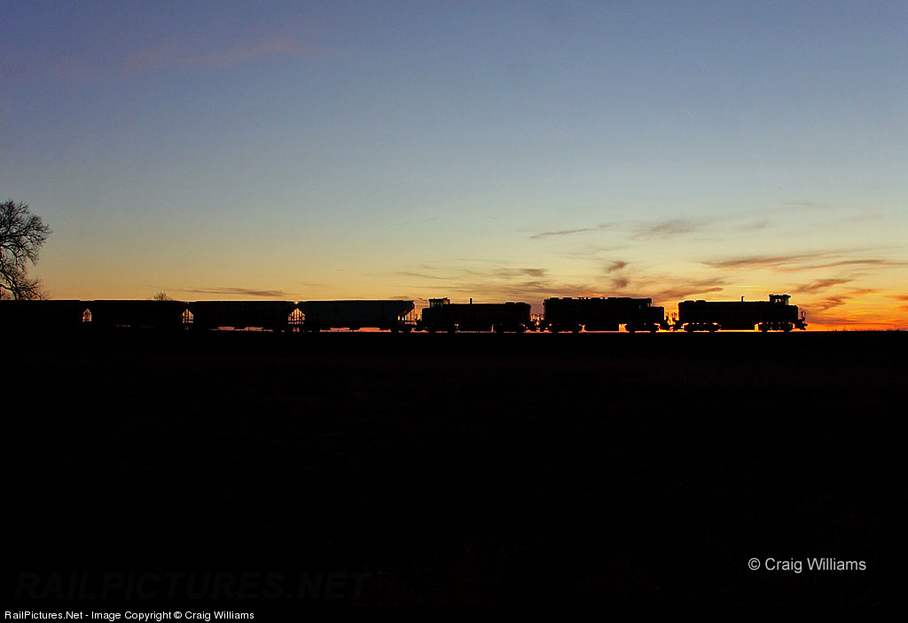 | Iowa Northern's Garner Job heads north at sunset towards Forest City. This is IANR new line they bought from the Union Pacific who wanted to abandoned the line. This is the 1st train since spring on this line which seen very little traffic towards the end of the UP days. IANR hopes to build to 2,500 car loads in 2012 and go up from there. |