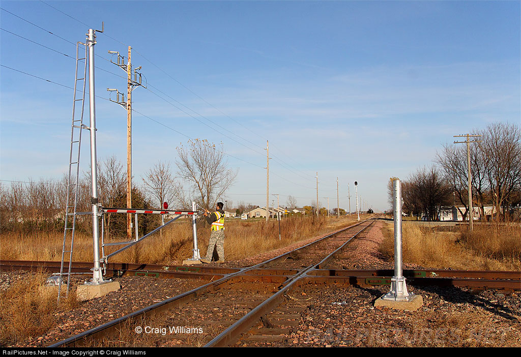 Iowa Northern's Garner Job is about to start spotting empties at Garner, so the conductor lines the gates for IANR movement over the DM&E's Sheldon Sub. This is the 1st train since spring on this line which seen very little traffic towards the end of the Union Pacific days. IANR hopes to build to 2,500 car loads in 2012 and go up from there on this new line they bought.