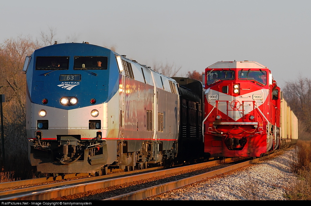 | Empire Builders - Amtrak #7 and Indiana Railroad, both Empire Builders of sorts. These guys don't get a chance to get much face time together, but here we have "America's Engineer" C-Liner Willett on America's Train, screaming by an empty CP/INRD- Fayette coke train east of Tamrack. This action happened on the CP Watertown Sub. |