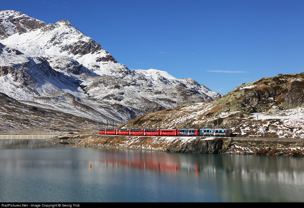 | ABe 4/4 53 with paint scheme for Credito Valtellinese and 56 "RE Power" are pulling the panorama cars of the Bernina Express from Chur to Tirano along the Lago Bianco. Albula and Bernina line have the label of UNESCO world heritage. |