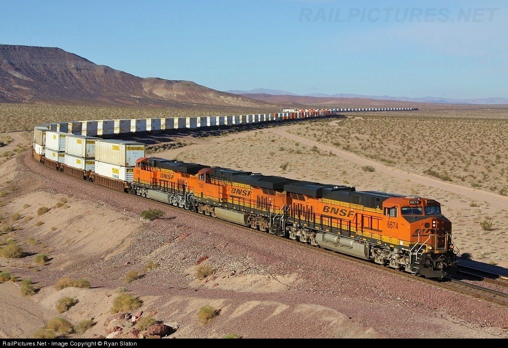 | A pair of GE ES44C4's bracket a standard ES44DC on the head of an eastbound double stack train. The "C4s" differ from normal ES44AC's in that they have A-1-A trucks and are so far unique to the BNSF. |
