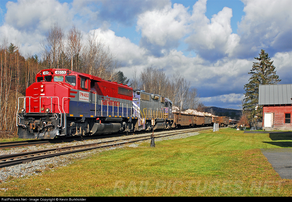 | TPW GP40-2W 4053 and NECR (ex-GEXR/NCVA) GP38 3843 break out into more gorgeous sun at Roxbury, VT with 25 loads of rock for Bethel, VT. Many more photos at http://steelwheelsphotography.com. |