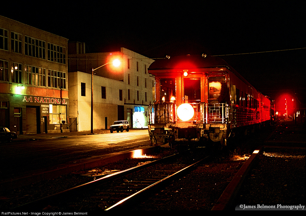Coupled to the SP 9809 West, Philip Anschutz business cars 'Kansas' and 'Utah' await passage through Grant Tower in Salt Lake City. The equipment had participated in a celebration marking Utah's 100th Centennial of Statehood. Most of what you see in this perspective is gone now, having been removed for the Gateway Mall development.