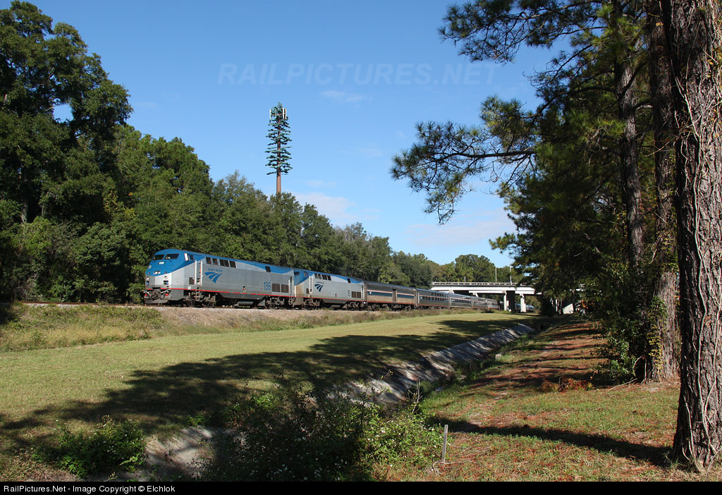 | AMTK P097 passes under Blanding Blvd, led by AMTK 136 & 15. In the backround you can see an as tree masked radio tower. |
