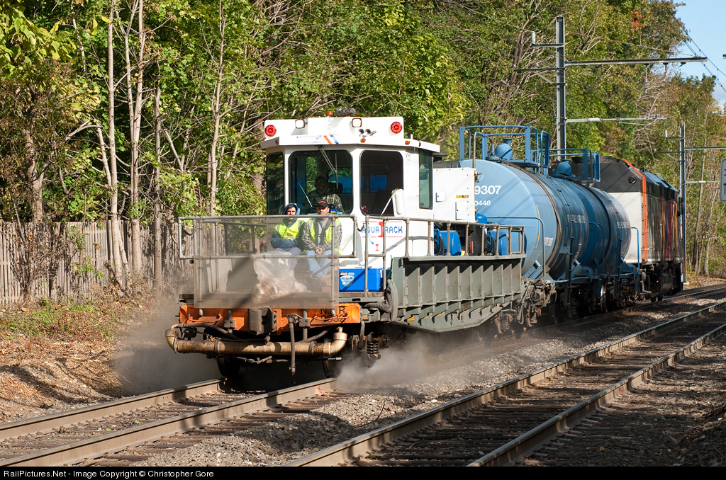 New Jersey Transit's Aqua Train going east on the Montclair Boonton Line. The Aqua Train sprays water under high pressure to clean the rails of leaves.