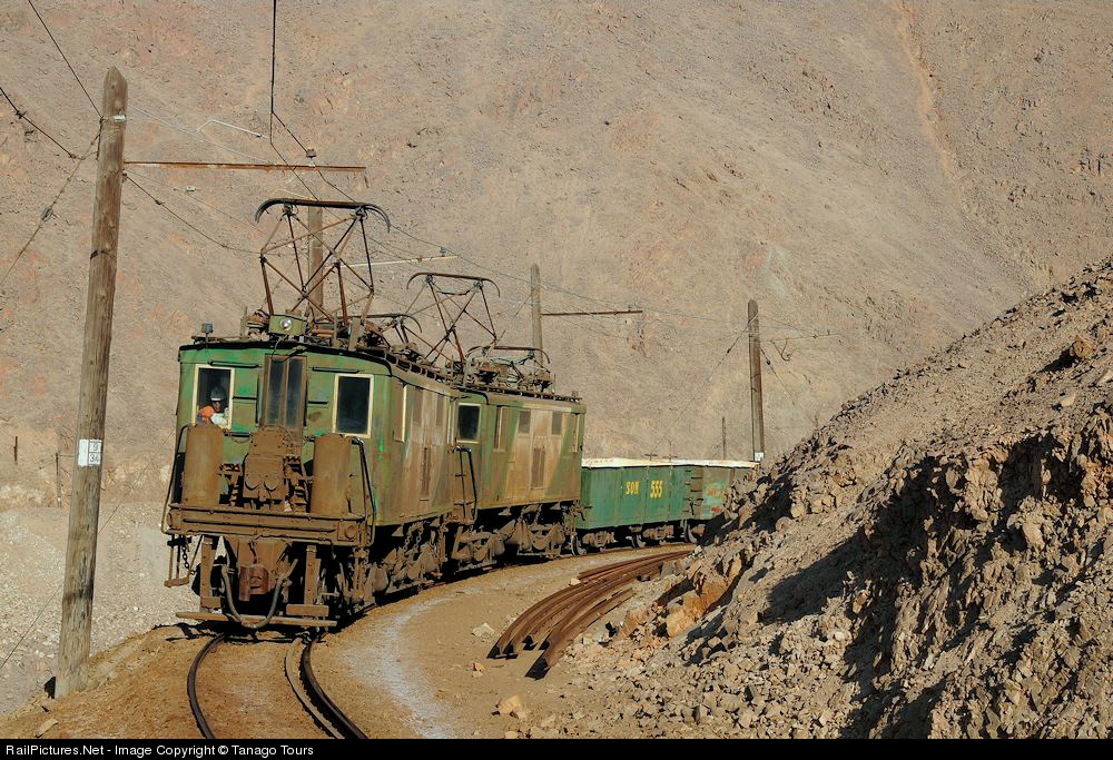 Yes, they are still going ... but are surely on their last leg. GE boxcabs 603 + 604 (ex FCCT, built 1927 in Schenectady (NY) haul an uphill train on the electrified section Topocilla - Barilles. Maintenance is poor: locomotives are dirty, mechnical problems lead to many disruptions. During our fact-finding-trip to prepare the April 2012 tour to Chile, we were told by SQM managers that only the slow delivery and some minor problems of the new electric locomotives keep the old dinosaurs alive for the time being. © www.Tanago-Tours.com