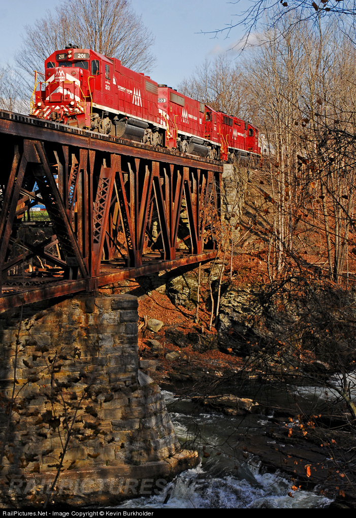 | The rare trio of matched Vermont Railway-painted power - VTR GP38-2 201, GP40-2 303 and GP40-2 307 - roll across the Hoosic River in North Hoosick, NY on the approach to Hoosick Jct. to deliver a loaded slurry train to Pan Am Southern. Vermont Rail System Guide Book coming soon and available at: http://steelwheelsphotography.com/pubs.html |
