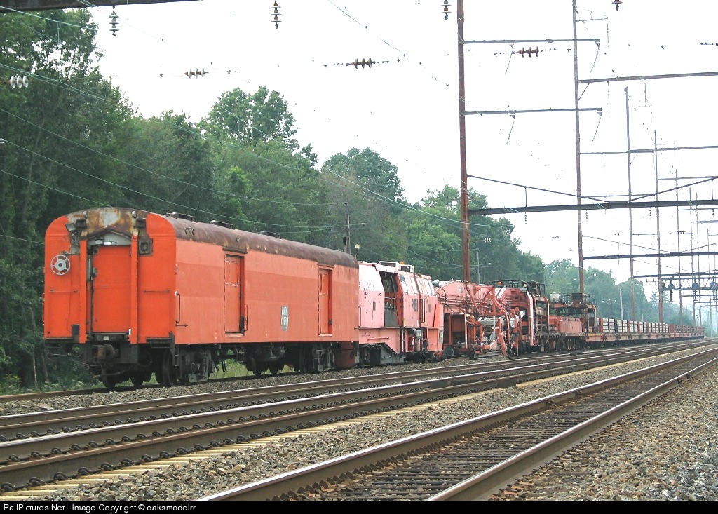 | Complete Amtrak Tie Laying Machine Train with tool car 17070, Model P-811 TLM, spike puller 15999 and tie flat cars just east of Croydon Station |