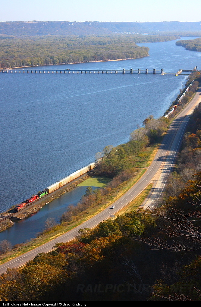 | CP's long distance intermodal heads upstream against the current of both the river and prevailing train traffic, passing Lock & Dam #5 (aka Whitman Dam), one of the widest on the Upper Mississippi. |