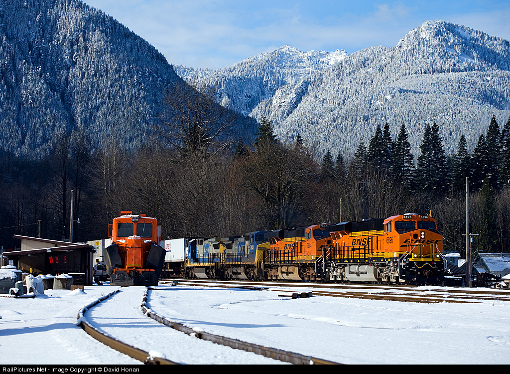 | Dwarfed by mountains that resemble a massive pile of sugar-coated pastries -- Dunkin' Donuts Munchkins, anyone? -- hotshot Z-SSECHC6-19A shatters the mid-day quiet in Skykomish. At left is parked BNSF's plow, which will likely see plenty of action this winter. |