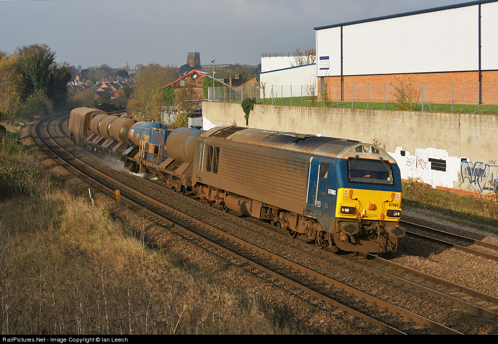 | A filthy 67003 ,in unbranded Arriva livery,passes Wellingborough on the Midland Mainlines railhead treatment train. |
