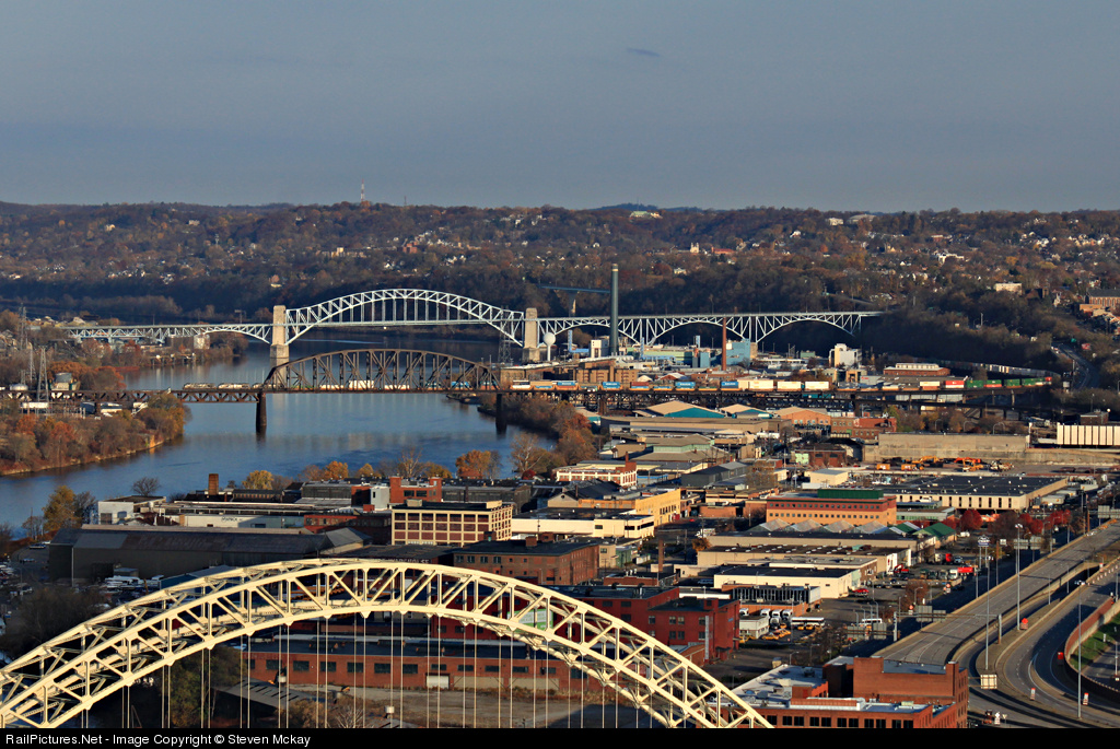 | One of only a handful of trains to during daylight due to a derailment in Altoona blocking all three mains, rolls across the OC bridge and starts it's trip down the Mon line behind a trio of GE's as it soars above the city. |