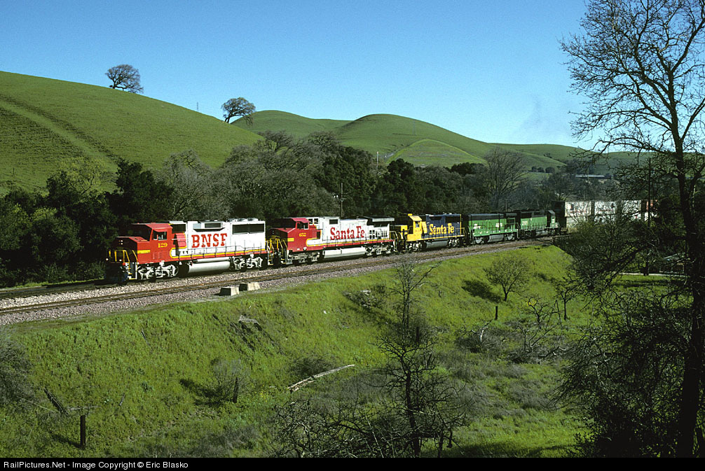 Mixed-bag consists like this one were fairly common in the early days of the BNSF merger. This westbound is passing through the location of Glen Frazer in Franklin Canyon, about 10 miles east of Richmond, California.