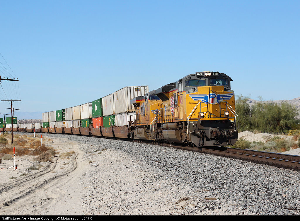 | Just east of Mecca, UP 8431 leads its Eastbound intermodal through the small vacation location of Bombay Beach along the shores of the Salten Sea. |
