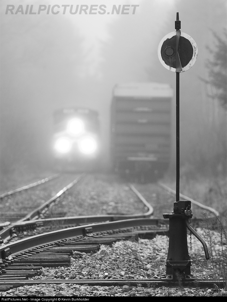 | In a somewhat typical fall weather pattern, fog has overspread the summit of the Green Mountains on the Green Mountain Railroad's Bellows Falls Subdivision. Nearing the crest of the hill is the GMRC train 263 with VTR GP40-2W 310 providing rail glint on the approach to the Summit Siding and the classic high switch stand indicative of the depth of snow reached here in the winter months. Vermont Rail System Guide Book coming soon and available at: http://steelwheelsphotography.com/pubs.html |