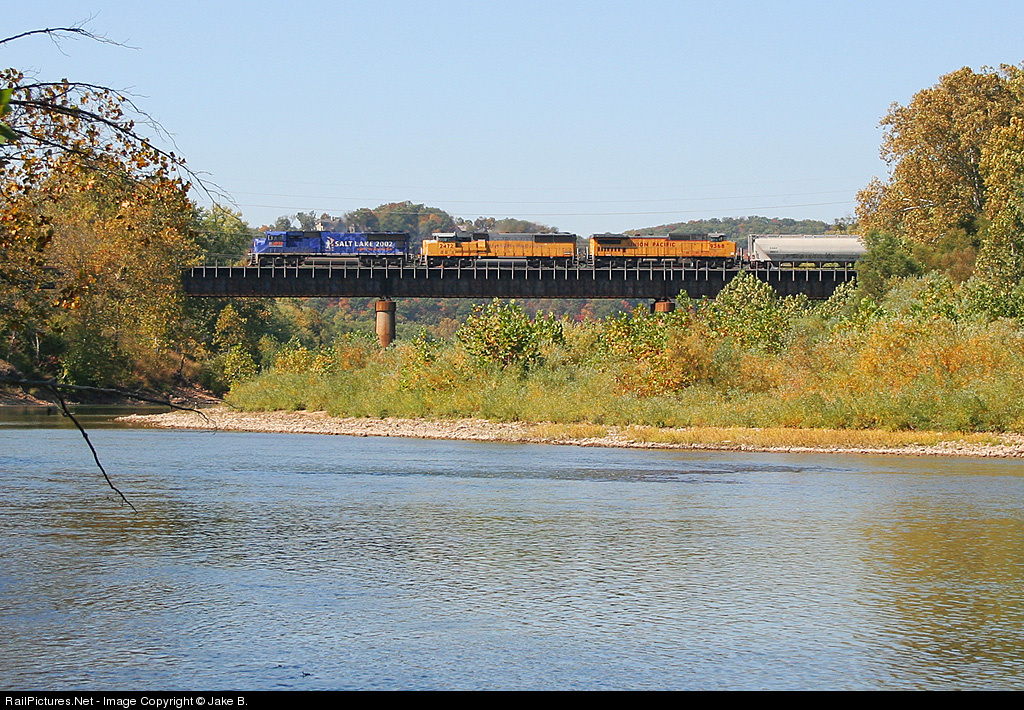 UP's Salt Lake City Olympic Torch Relay unit, UP 2002, leads a North Platte bound manifest across the scenic Meramec River. Seeing the blue unit poke out from behind the bushes was definitely a nice surprise. I had no idea that this engine was even in town, let alone coming westbound! Also in the consist are a couple of products from the 90s, an SD60M and a Dash 8.