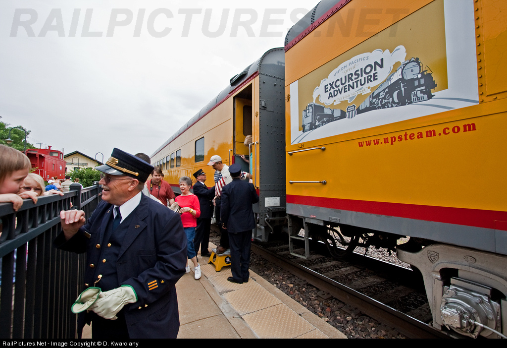 Conductor Coker shakes hands with little railfans in Washington, MO as guests exit the train after riding from Jefferson City to Washington. The trip was part of UP's online "You Route the Steam" excursion where the public got to choose UP 844's route.