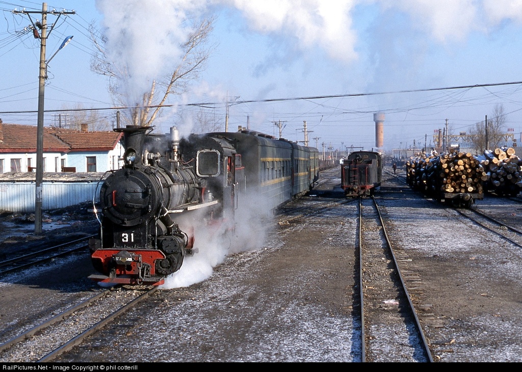 | Steam hauled passenger trains were one of the joys of the Weihe logging railway. Here 2 feet 6 inch gauge 0-8-0 No 31 leaves Weihe on the morning train to Liushan. A sister C2 loco arranges logging wagons. The railway closed down in 2003. |