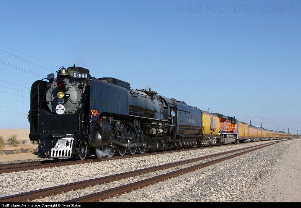 UP 844 gallups along UP's Gila Sub just west of Maricopa, AZ; MP 893. The 844 is well on her way towards her next service stop/brief display in Gila Bend. The big FEF-3 is heading for Yuma, AZ for the last Arizona centennial display, after the Yuma display she will start her trip home via Southern California and the LA&SL.