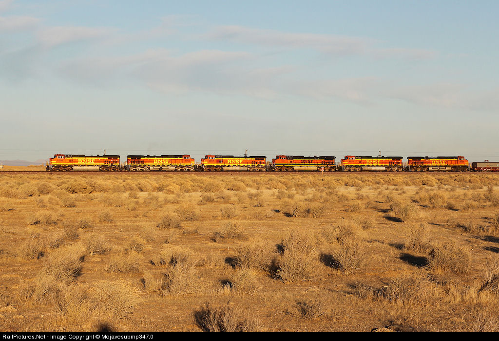 6 units head up this Westbound racing across the flat desert towards the Junction with the UP Mojave Sub for the run over the Tehachapi Mountains.