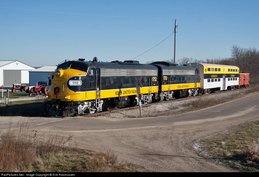 The Keokuk Junction FP9A's lead a borrowed Hawkeye Express bi-level and a Pioneer Lines caboose into Glasford with the annual Santa Train. The KJ offered train rides in the ex-CNW/Metra commuter car for a small donation going to the Salvation Army.
