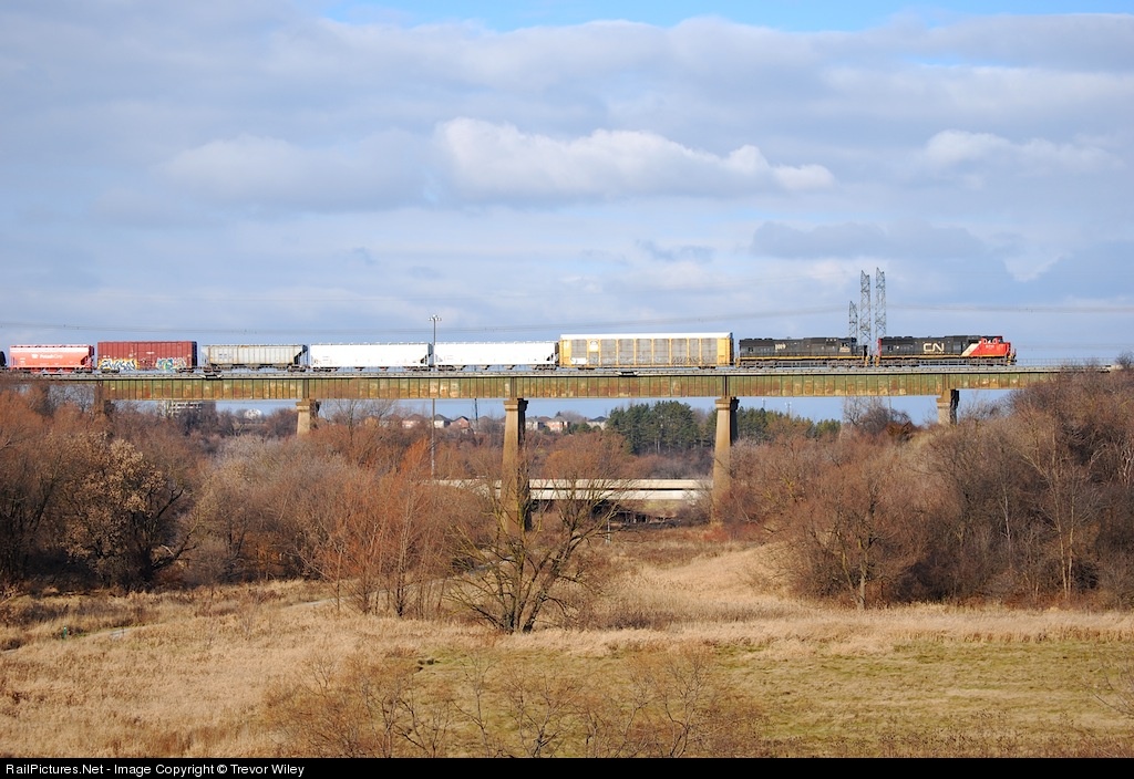 CN 370 rolls across the Humber Trestle in Vaughan, Ontario on the last stretch of his journey on the Halton sub terminating in Macmillan Yard.