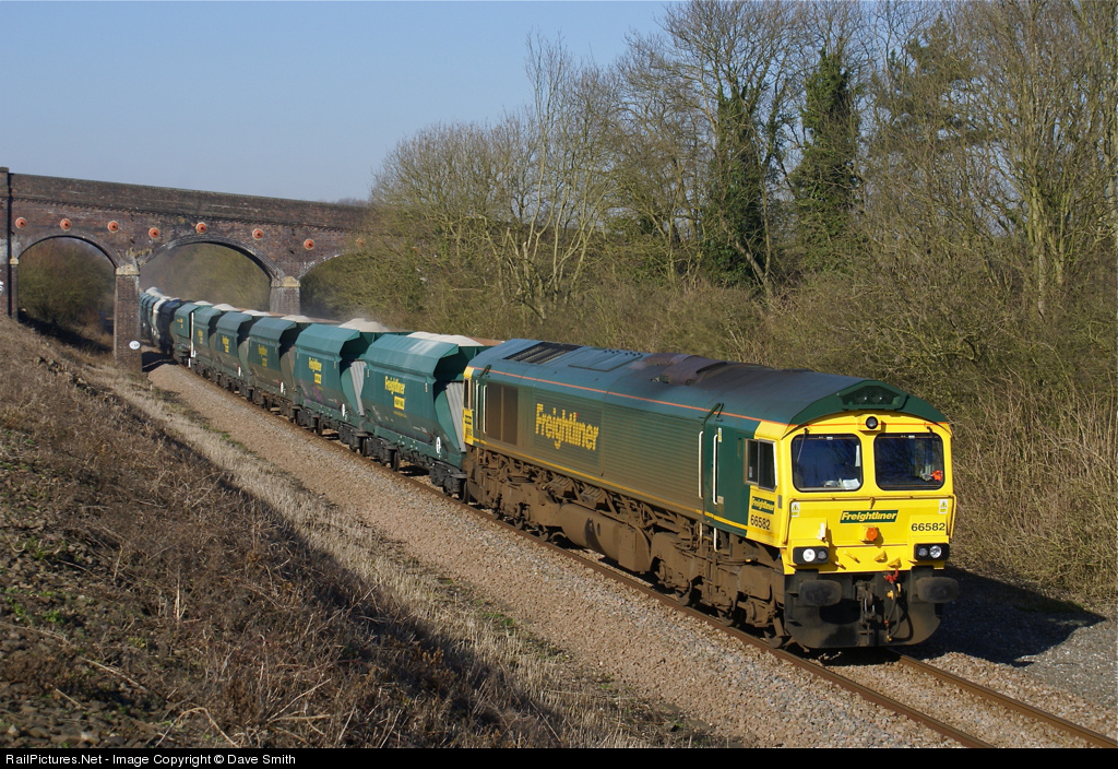 | 66582 passes Souldrop in Bedfordshire with a Croft to Neasden aggregate train, this is one of many locomotives now working in Poland for Freightliner . |