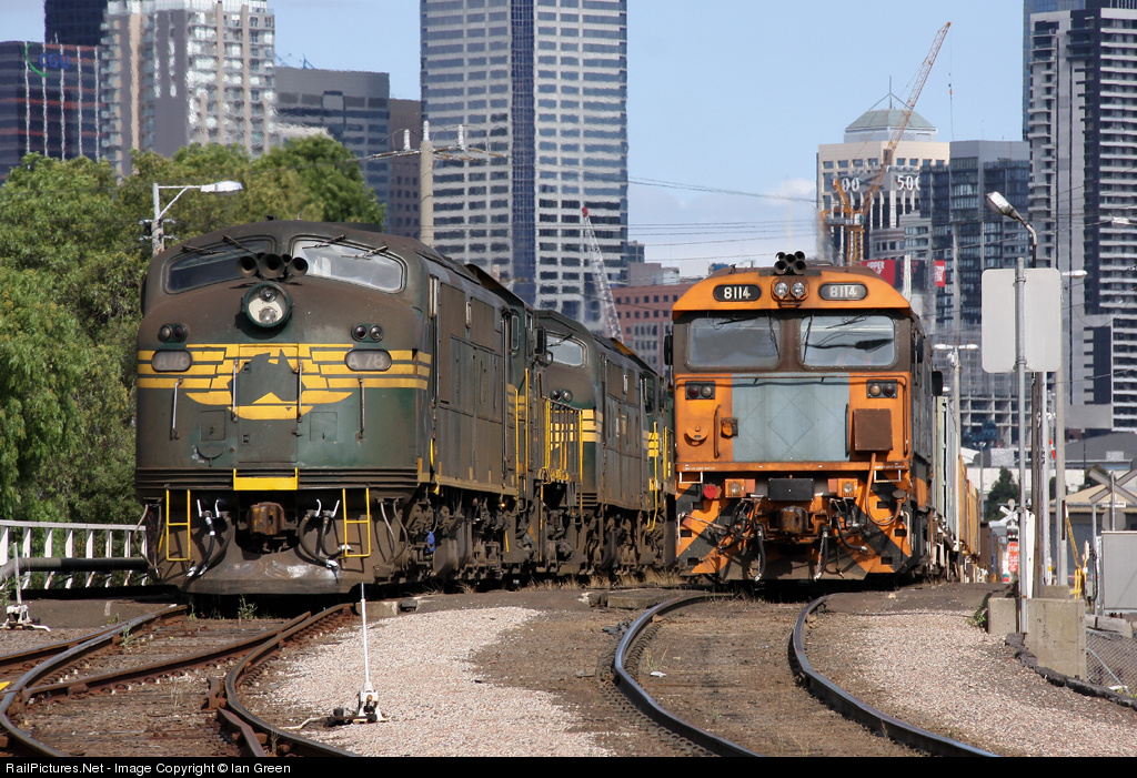 A78 leading a broad gauge light loco movement to Appleton Dock pauses next to 8114 shunting standard gauge wagons near the Moonee Ponds Creek.