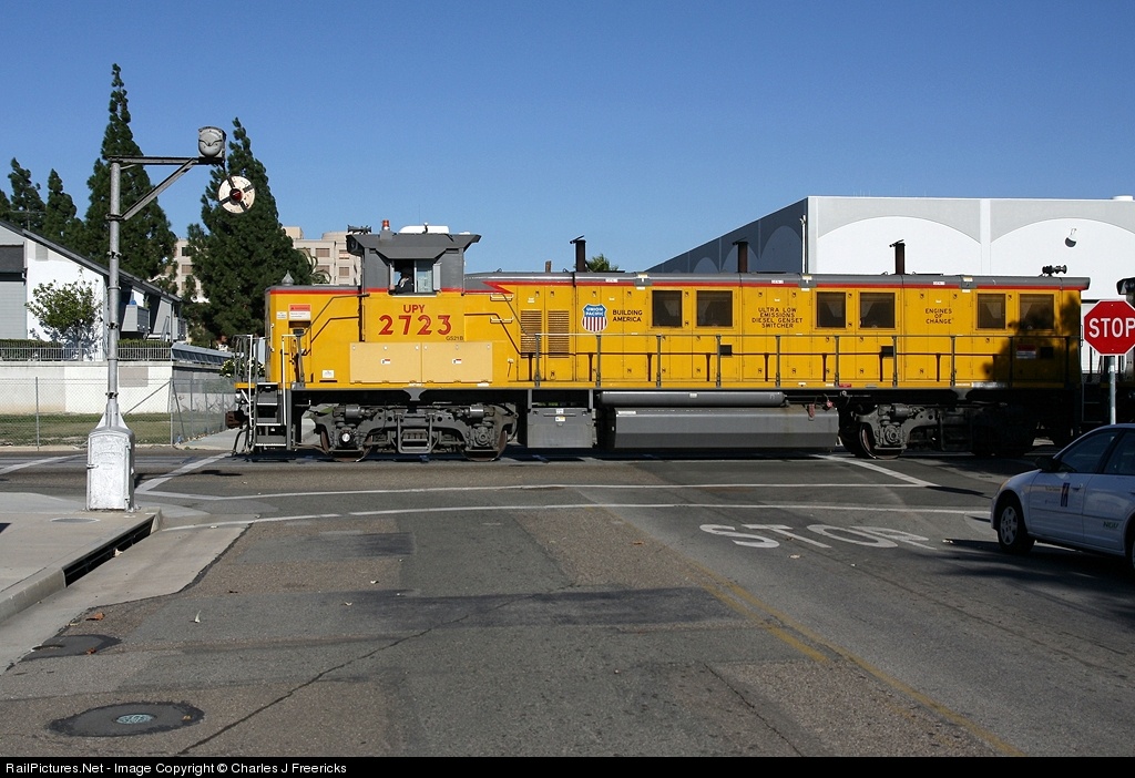 | The Union Pacific's Coast Mesa Local is returning from its early morning work in Santa Ana. It is seen here accomplishing two rather odd railroad feats in modern day RRs. It is street running and it has triggered a wigwag signal (one of the last in So Cal). Many breathed a sigh of relief when this train continued to run after the demise of its main customer, the LA Times Coast Mesa printing plant. |