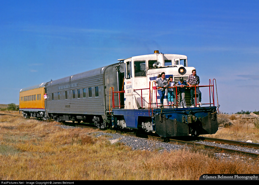 | A Salt Lake Garfield & Western passenger special rambles slowly through the salt grass near the Salt Lake International Airport. The SLGW ran passenger specials every fall when model train shows were held at the Utah State Fairpark. The SLGW is a family owned operation, and the owner Don Hogle was happy to let folks ride on the pilot of their 44 ton GE. It appears the kids are having a terrific time riding the D.S.5. |