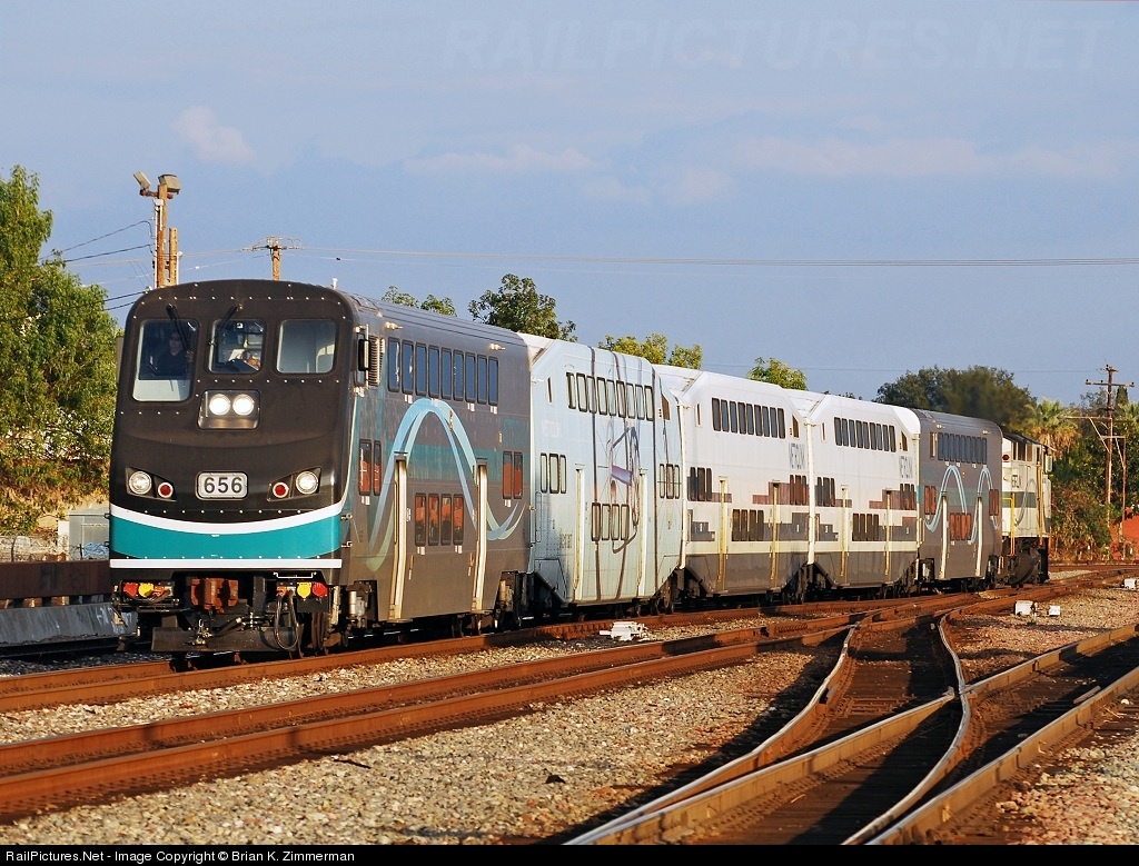 | Weekend OC Line Metrolink train 663 heading for Los Angeles shortly after departing Laguna Niguel/Mission Viejo station. At this point in Winter, the train comes at sunset. Also notice the bike car. Please see my video at http://www.youtube.com/watch?v=rTo13dX_dOo for more views of the two wraps. |