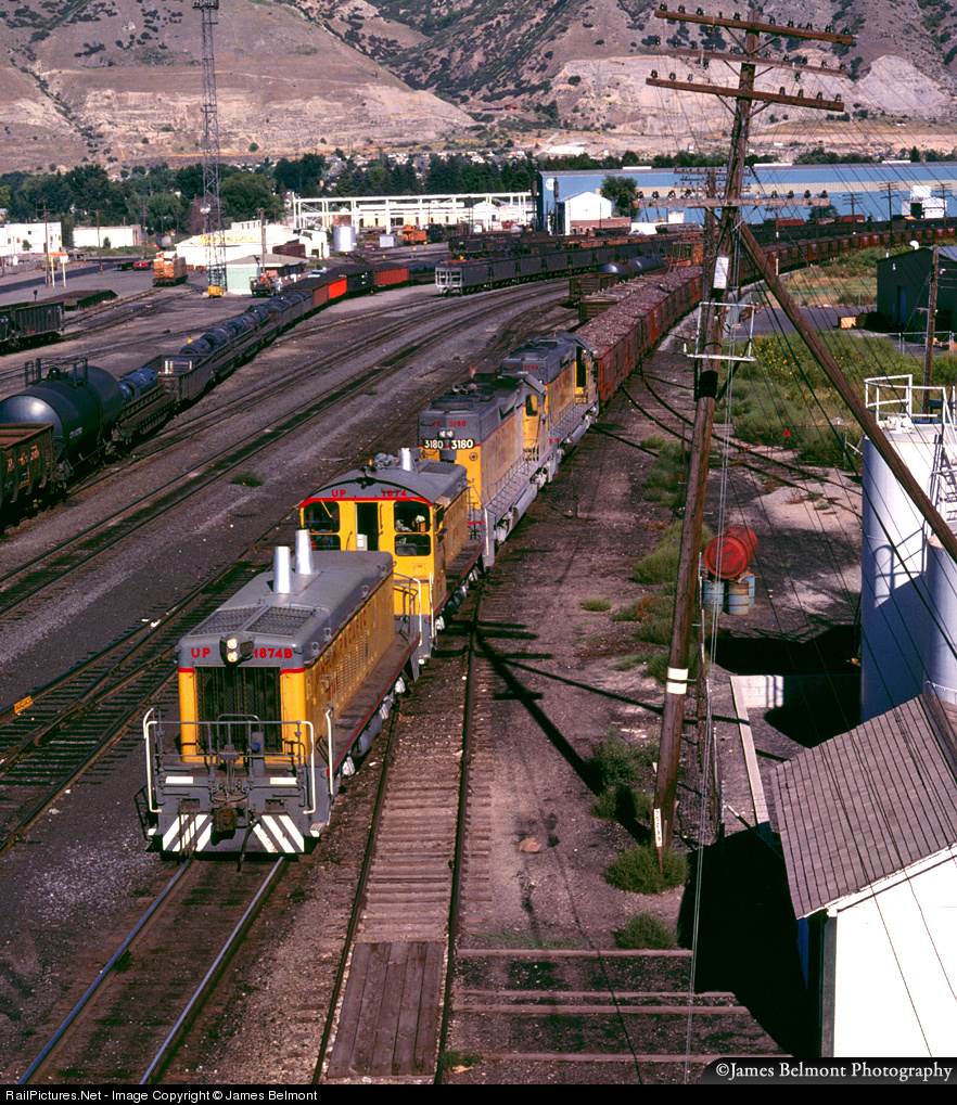Here's one of my favorite Kodachrome slides taken when I chased trains via my Azuki 10-speed bike I named 'White Lightning'. Union Pacific's Provo Switcher departs Provo yard for Geneva Works with a long train of Iron Mountain ore for the steel mill. A few tracks over, a Rio Grande manifest picks up a cut of coil and plate steel (from Geneva Works) to interchange with the Western Pacific at Roper Yard in Salt Lake City. Some details in this view from University Avenue bridge include the Utoco bulk plant (at right) and in the distance, the PDM (Pittsburgh Des Moines) steel fabrication plant, Rio Grande's small engine servicing facility with two cabooses spotted on the cab track, and at far left, the D&RGW yard office and team tracks.