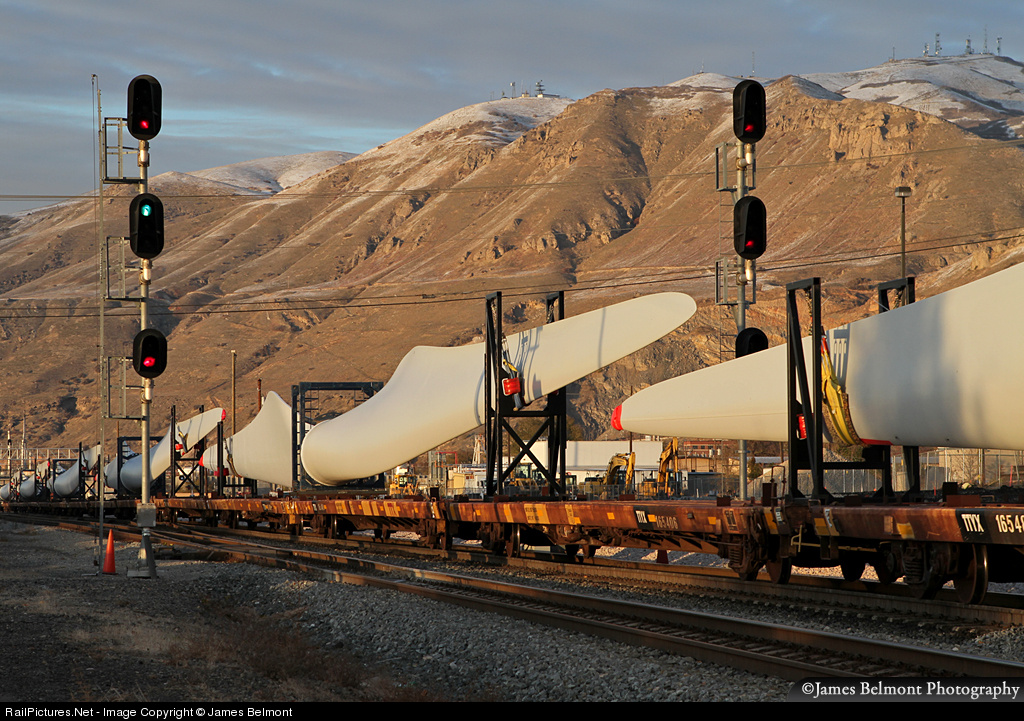 A lengthy train of windmill blades departs Salt Lake City for a trip west along the LA&SL to California.