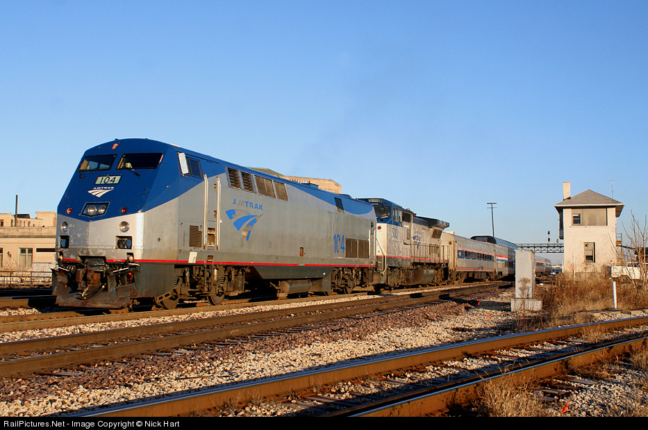 | #301 departs Joliet, with Amtrak 104 and 500, followed by Amtrak's dome car, which is shuffling between Chicago and St. Louis for the holiday season. |