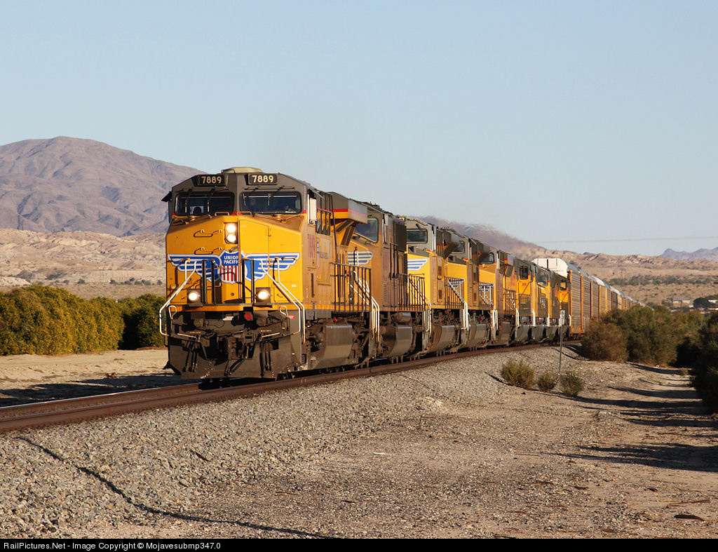 | UP 7889 leads this Westbound along the Yuma Sub near Mecca. Back in the concest are SD59's 9901, 9904, 9905, and 9909. |