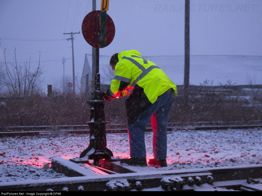 With the years first real snowfall, the switch lock has froze up. Here the engineer tries his hand at getting it thawed.
