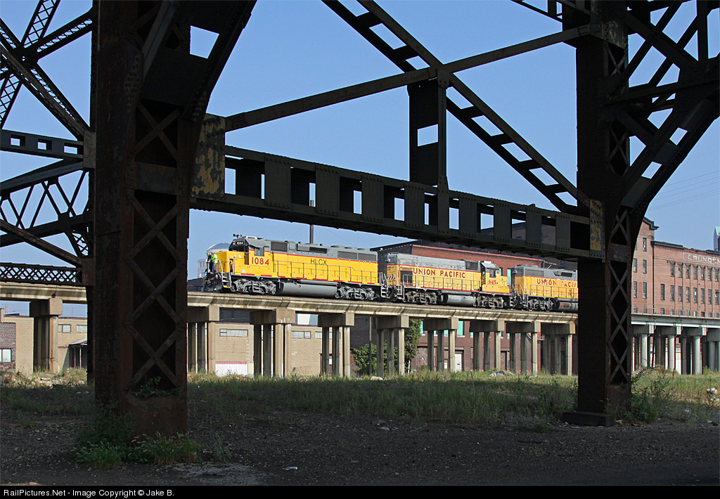 The interesting geometry of the MacArthur Bridge frames a trio of light UP engines as they drop down to the Lesperance Street Yard. Two crewmen are getting a good view from the front of the lead unit. Second in the consist is an ex-MP GP15-1.