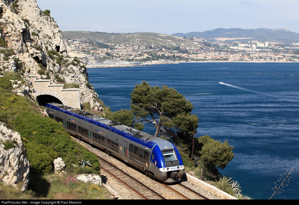 This local train from Marseille to Miramas skirts the Mediterranean sea with the Estaque gulf in the backdrop. The Bombardier B 81500 is a dual mode electric DC 1,5 kV and diesel train, MAN engines and asynchronous traction motors equiped.