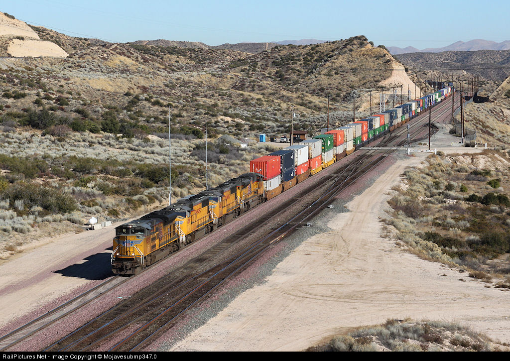 Having crested the east slope of Cajon Pass, this UP westbound has downhill running ahead, but first will crossover to the UP Mojave Sub at Silverwood.
