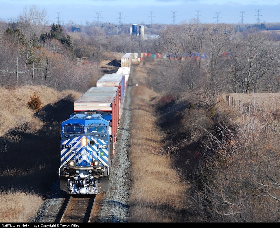 With mis-matched number boards, CEFX 1047 scurries 113's intermodal with some mixed freight up front westbound on the Belleville sub.