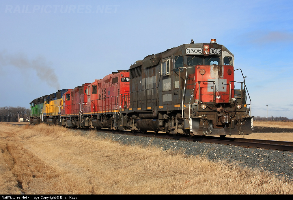 Two former CP, one former UP/SP, one former BN, and one in legit paint...just a typical line-up of Northern Plains Railway locomotives! The TRF turn runs light towards the CPR yard to retrieve its strings of hoppers.